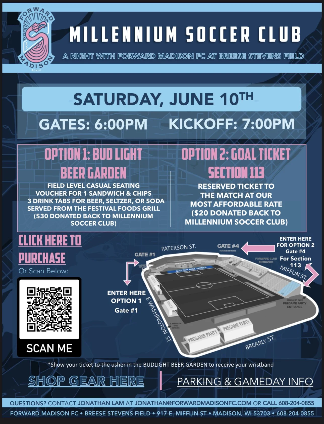 June 10th Forward Game Fundraiser! Buy Tickets Here Buy tickets through this special link and the money from the ticket sales will help fund Millennium fall programming! Millennium Soccer ClubMay 24, 2023 Facebook0 Twitter Pinterest0 0 Likes